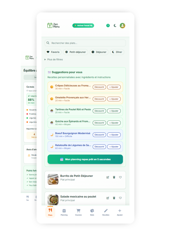 Zen Menu vous libère du “qu’est-ce qu’on mange ?” permanent. Vous voyez votre semaine, vous savez où vous allez, et vous n’êtes plus obligé de réfléchir au jour le jour. Vous vous déchargez mentalement, tout simplement.